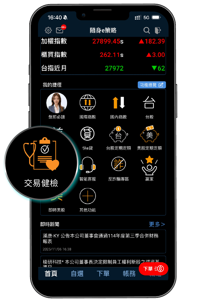 凱基期貨既有客戶可透過「凱基隨身 e 策 略」、「新超級大三元」與「凱基智能通」任 一平台,隨時隨地產出健檢報告。