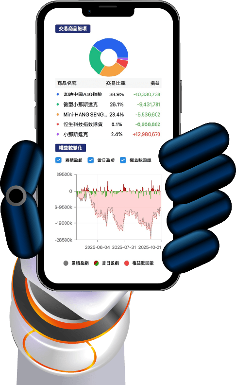 交易數據結合圖型化與關鍵績效指標(勝率、盈虧比、操作多空比、MDD…等),助您快速判讀整體交易品質。