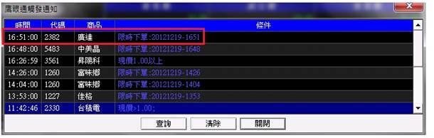 彈跳出觸發通知視窗,客戶可進行查看觸發結果,且通知視窗都可再於當日訊息公告進行查看。