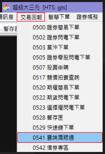 在超級大三元系統中,輸入畫面代碼0541雲端鷹眼通,以trust機制將另開一個視窗(網頁)登入鷹 眼通系統,