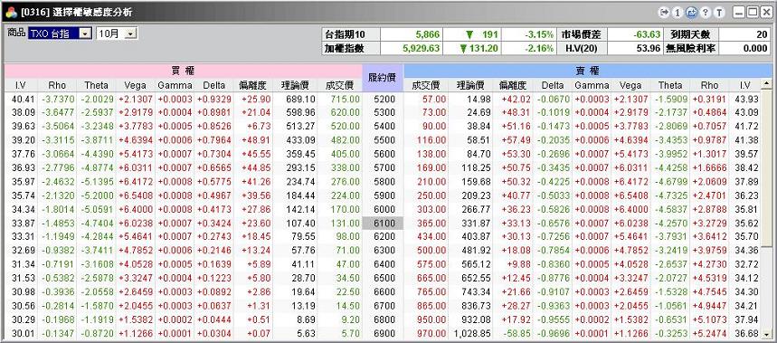 操作說明:下拉可選擇商品別及其契約月份,表內即列出該月份商品的各個履約價敏感度分析。 於表內任一處按下滑鼠右鍵顯示連結畫面設定、儲存至Excel,請參閱常用功能簡介(一)。