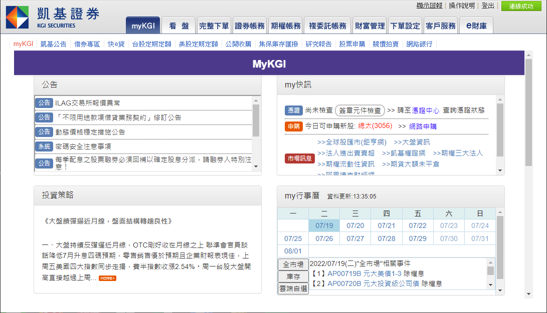 群組按鈕:列出〔myKGI〕、〔看盤〕、〔完整下單〕、〔證券帳務〕、〔期權帳務〕、〔複委託帳務〕、〔財富管理〕、〔下單設定〕、〔客戶服務〕、〔e財庫〕九大群組按鈕。