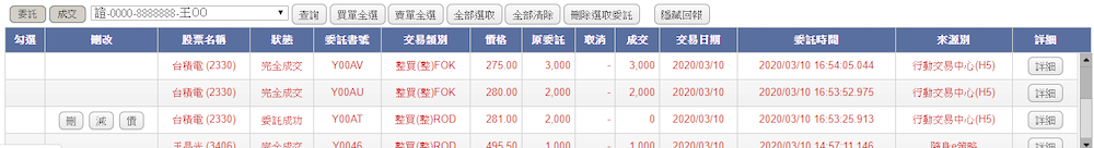 )按鈕,回報列會 更新所選擇「委託」或「 成交」的查詢資料。
