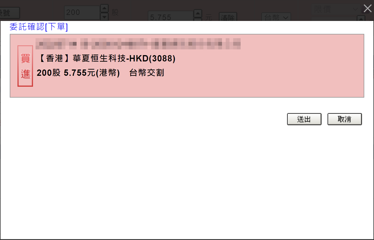 )按鈕,會彈出「交易確認」小視窗如下圖,按下〔送出〕鈕,即可送出委託;若按下〔取消〕鈕,則「取消」本筆委託。