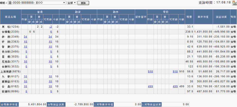 點選系統的〔證券帳務〕按鈕,再點選〔庫存查詢〕標籤。