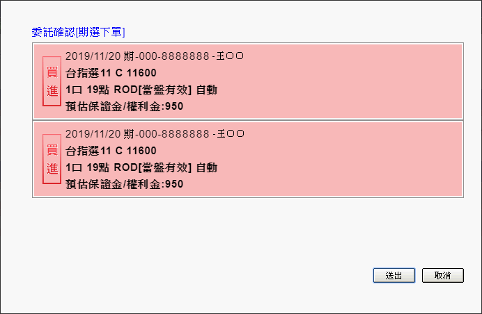 )按鈕,可將多筆下單的委託資料核取方塊已勾選的委託資料「送出」,同時彈出 「委託確認」視窗如下圖,若按下〔取消〕鈕,則「取消」本筆委託。