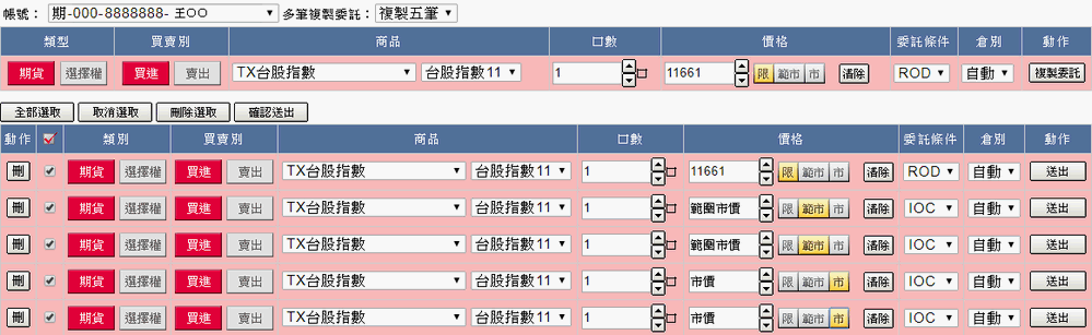 )按鈕, 可將上方下單列所選擇的委託內容複製至下方的多筆下單列中。