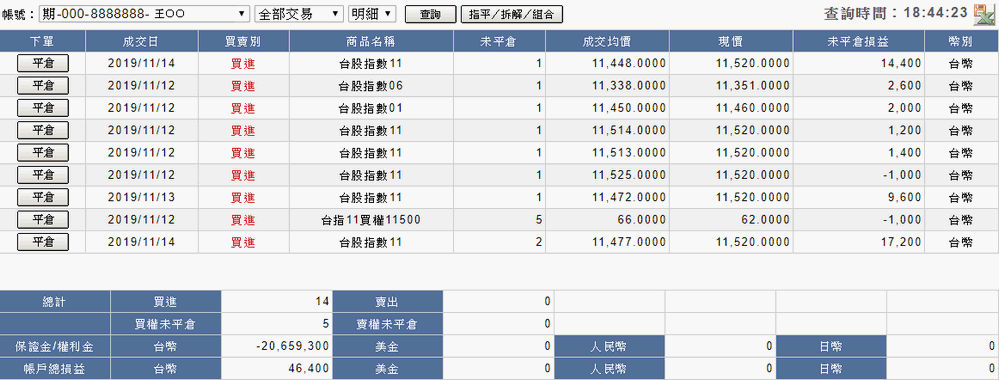 ) 由下拉式選單選擇查詢「全部交易」、「期貨單式」、「期貨複式」、「選擇權單式」、「選擇權複式」、「選擇權部位」。 |