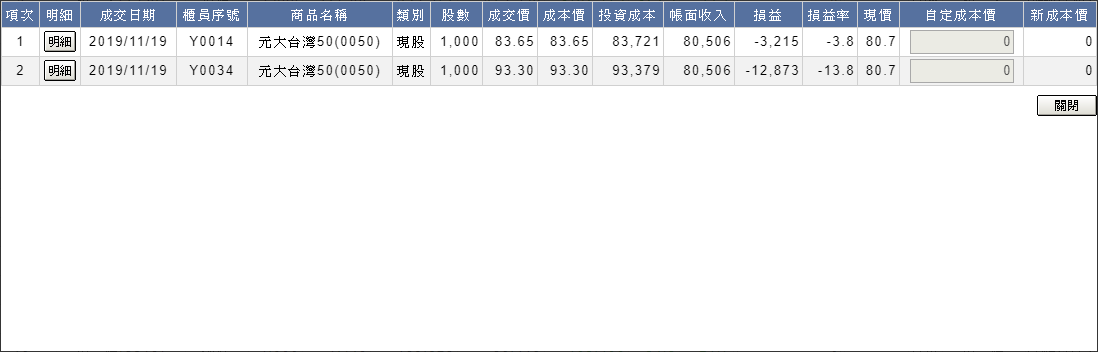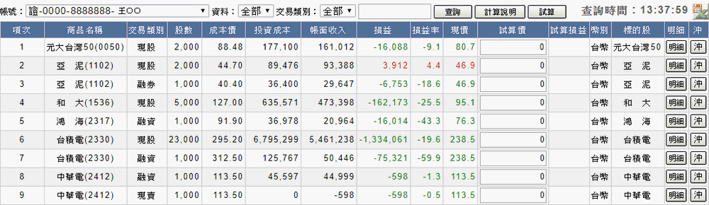 )交易類別下拉式選單提供「全部」、「現股」、「現賣」、「融資」、「融券」等不同的類別。